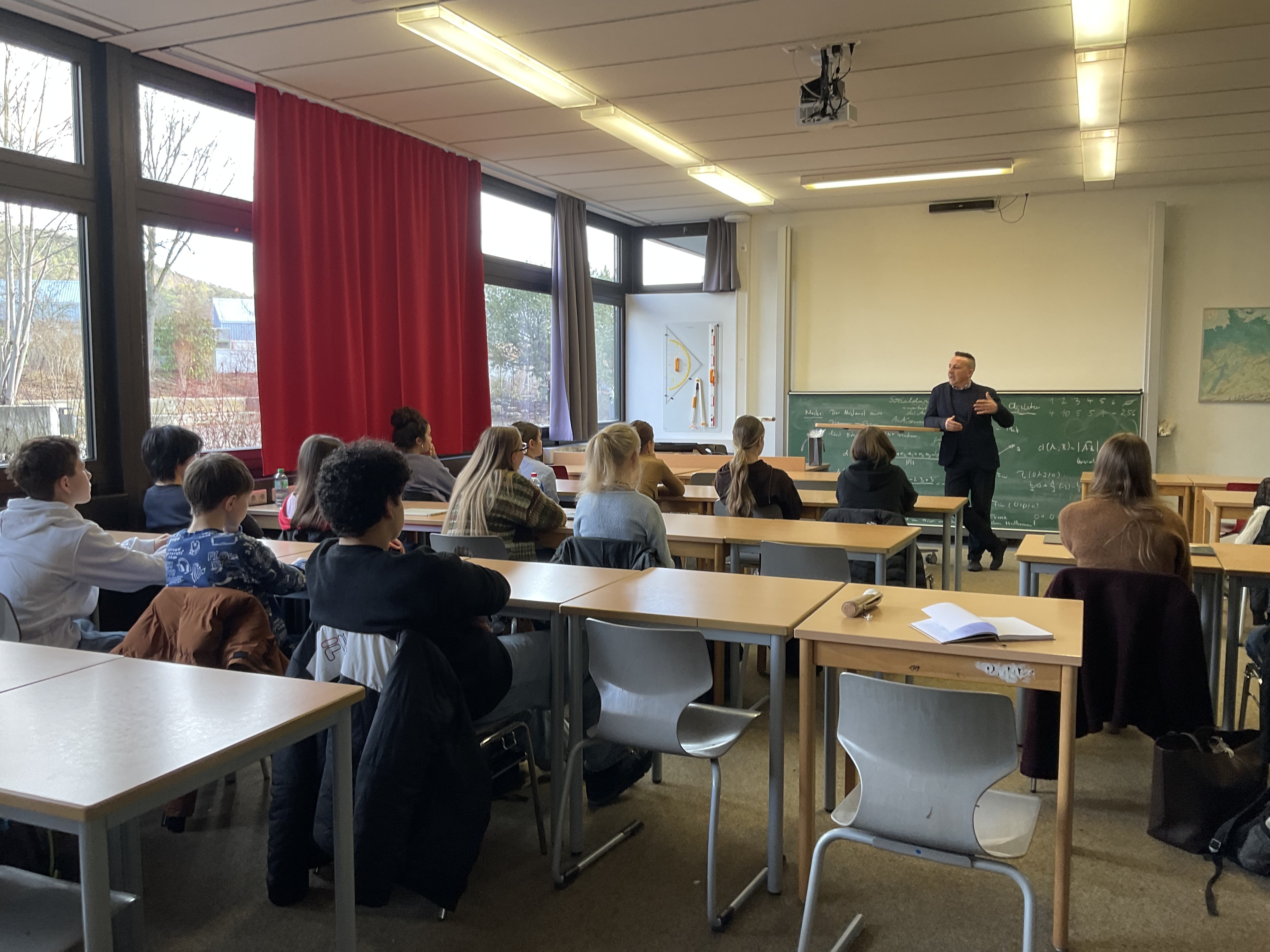 Für die achten Klassen wartete am Freitag, den 21.11.2025, eine besondere Schulstunde auf sie. Sieben Beteiligte lasen von der zweiten bis zur fünften Stunde jeweils einer achten Klasse vor. Die Achtklässlerinnen und Achtklässler durften Herrn Sattler, Frau Walter, Frau Uhthoff und Herrn Simon als Vertreter der Lehrkräfte lauschen sowie Claire Neder (11. Klasse), Magdalena Pittroff (12. Klasse) und Theodor Zimmer (13. Klasse) von Seiten der Schülerschaft.