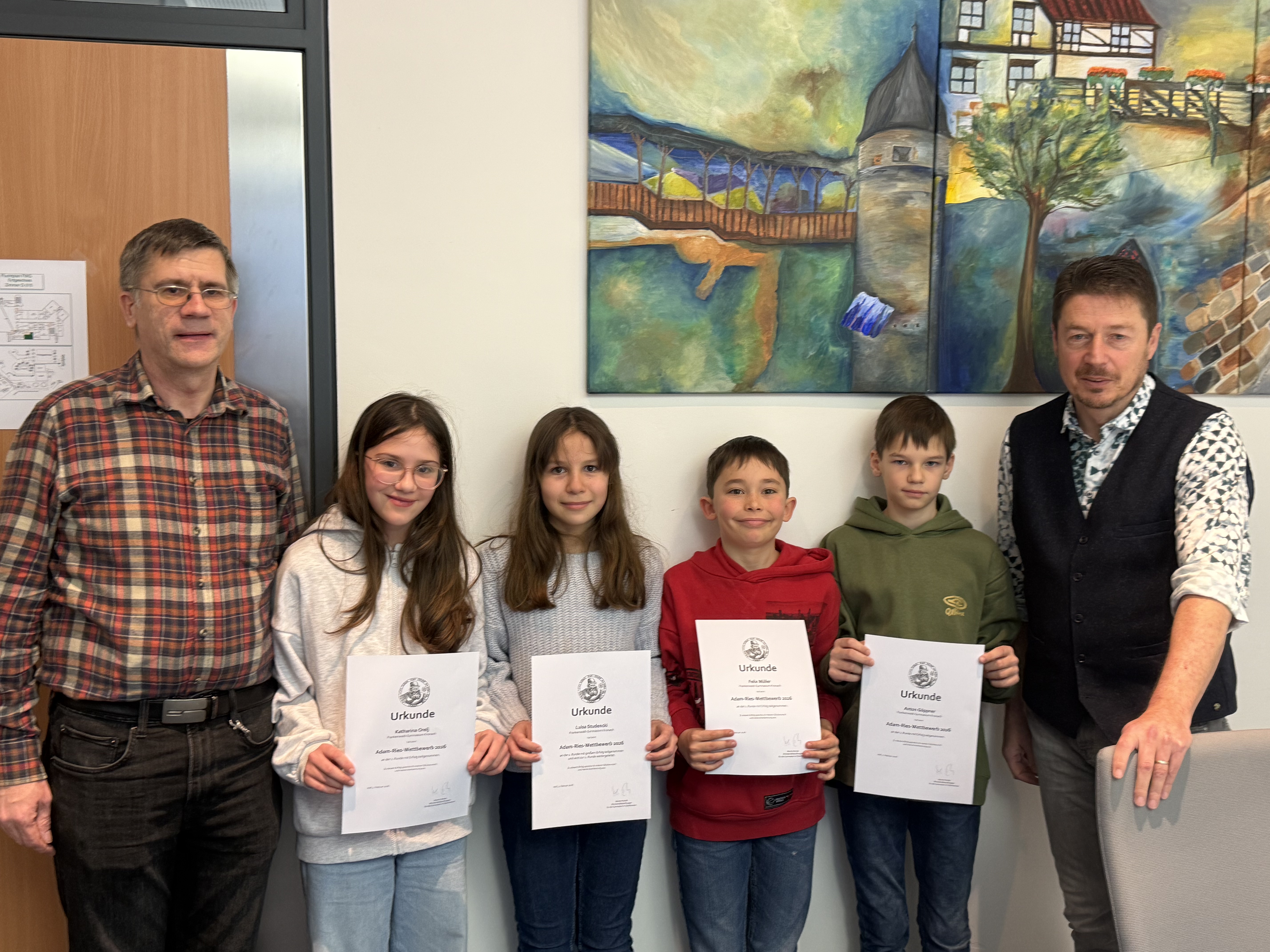 Während sich die Jury, bestehend aus Herrn Sattler, Frau Aust und Frau Hanke, beratend zurückzog, durften sich die Schülerinnen und Schüler in Klein-Gruppen über ihr im Zuge des Klassenentscheids gelesenen Buches unterhalten und austauschen. Schließlich war es soweit: Die Jury kehrte zurück und verkündete das Ergebnis.